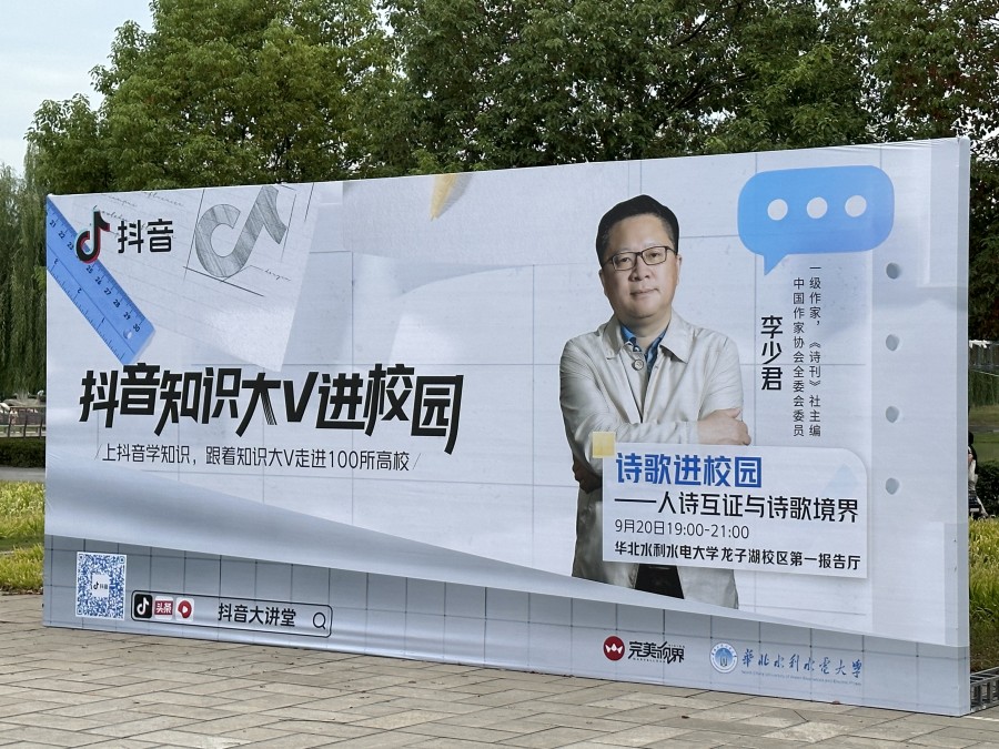 9月20日晚上7点,“抖音知识大V进校园之诗歌进校园”主题活动在华北水利水电大学举办,《诗刊》社主编李少君在现场向高校学生做了分享,他的讲座主题是“人诗互证与诗歌境界”。