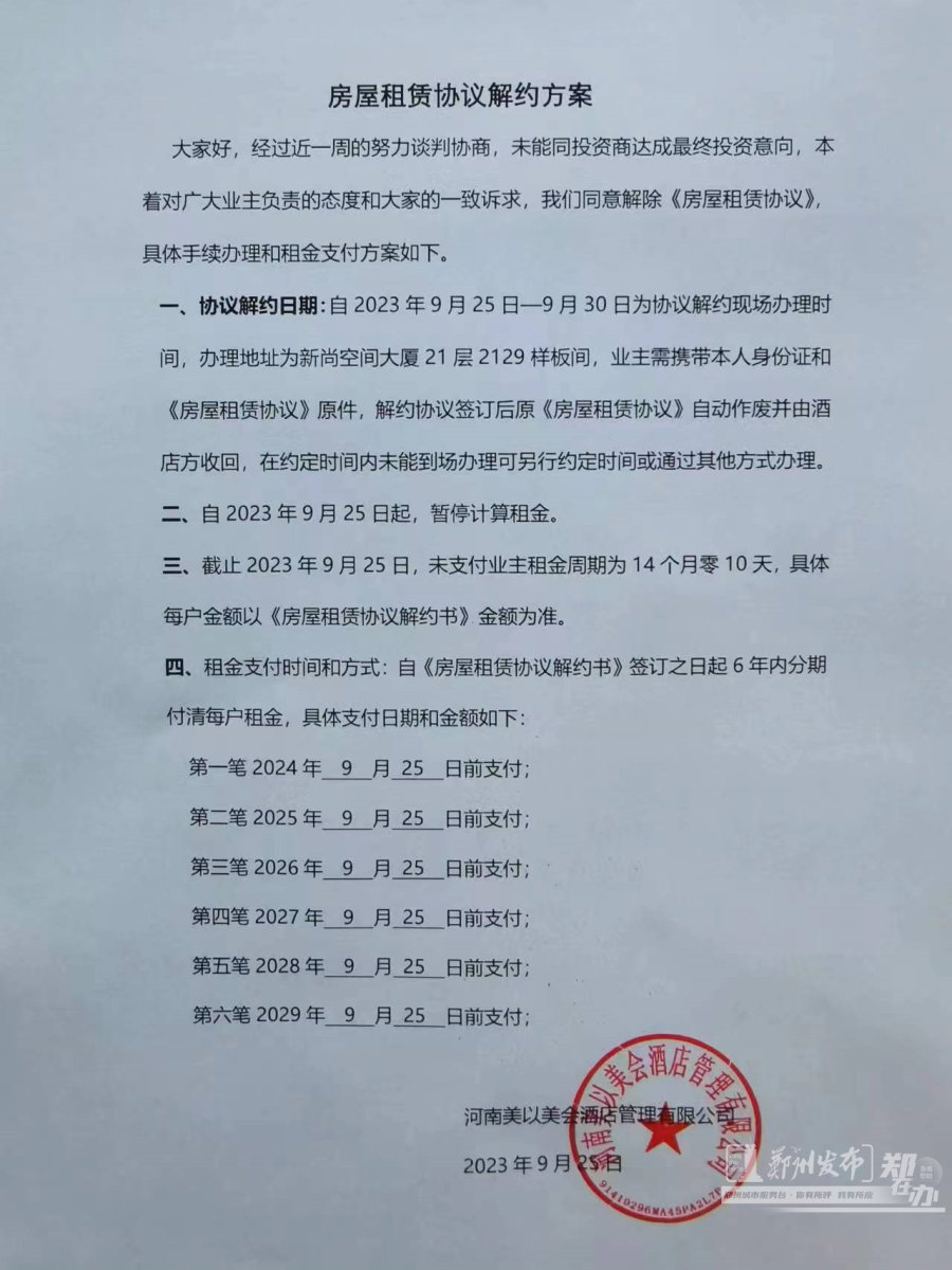 9月25日,河南美以美会酒店管理有限公司发出一份《房屋租赁协议解约方案》,称“经过近一周的努力谈判协商,未能同投资商达成最终投资意向,本着对广大业主负责的态度和大家的一致诉求,我们同意解除《房屋租赁协议》”。这一方案对解约时的手续办理和租金支付方案进行了说明,称“自2023年9月25日起,暂停计算租金”“截至2023年9月25日,未支付业主租金周期为14个月零10天”,并给出了“自房屋租赁协议解约书签订之日起6年内分期付清每户租金”,但全文未提及是否全部或部分退回60余位业主所交的装修款。