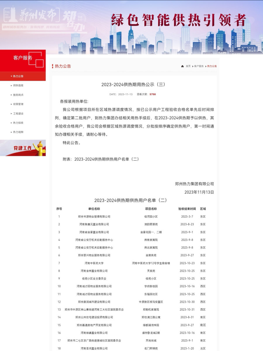 随后,记者查看发布于11月13日的《2023—2024供热期用热公示(三)》,其中《2023—2024供热期供热用户名单(二)》有“河南天林置业天宸苑小区”,验收结束时间为“2023年10月25日”,所属区域为“东区”。