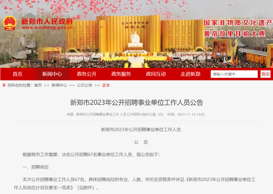 11月14日,新郑市人民政府网站发布2023年公开招聘事业单位工作人员公告,根据工作需要,决定公开招聘67名事业单位工作人员。