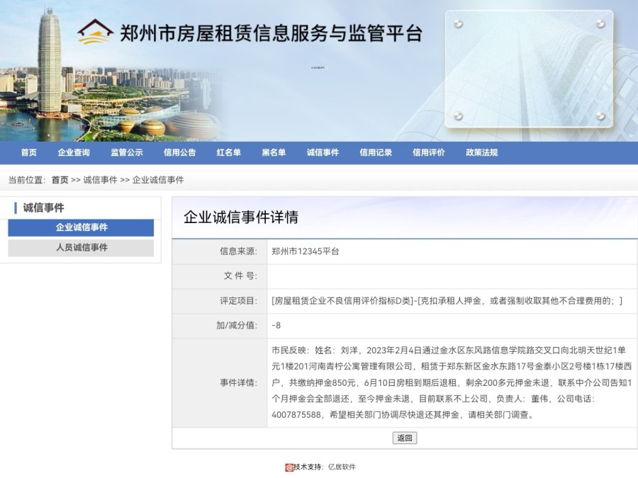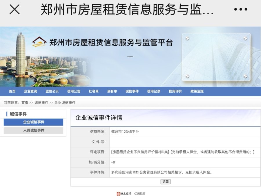 今年以来,郑州市房屋租赁信息服务与监管平台因“多次接到河南青柠公寓管理有限公司相关投诉,克扣承租人押金”,而多次减扣该公司的企业诚信分值。