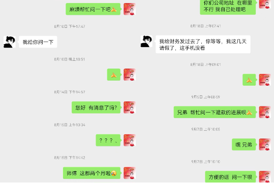王先生提供的微信截图显示,管家于7月26日曾回复退款时间为“下个月10号之前”,随后他对1200元的应退款项进行询问未获正面确认,8月10日再度询问退费进度时对方称“问一下”,此后至12月上旬的多次催问,仅收获两三条“请假了”“我催催”的回复内容。