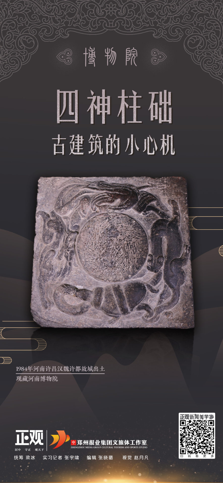 河南博物院馆藏的四神柱础,是一件三国时期魏国的柱础石,1984年冬出土于许昌县张潘乡盆李村(汉魏许都故城范围内)。其为青石质,平面近方形,边长62.5-63.5厘米,高15.5厘米,表面以“剔地起突”雕刻手法高浮雕古代四方定位之神,即青龙、白虎、朱雀、玄武四位兽神,这也正是“四神柱础”的名字由来。