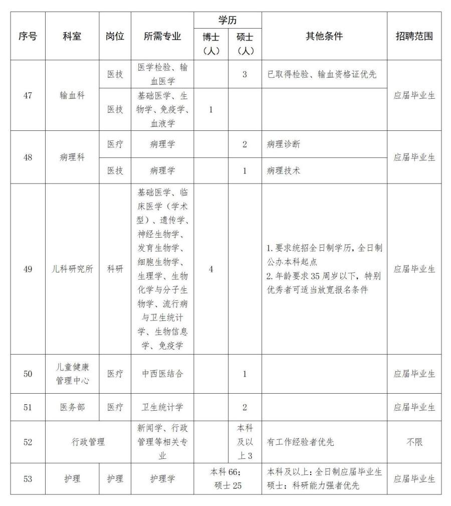 要求:第一学历为全日制本科(高中起点),取得普通高等教育硕士研究生学历、学位;取得岗位所需专业技术资格证书,医疗专业应取得住院医师规范化培训证书;具有大学英语六级证书或六级成绩425分(含)以上。