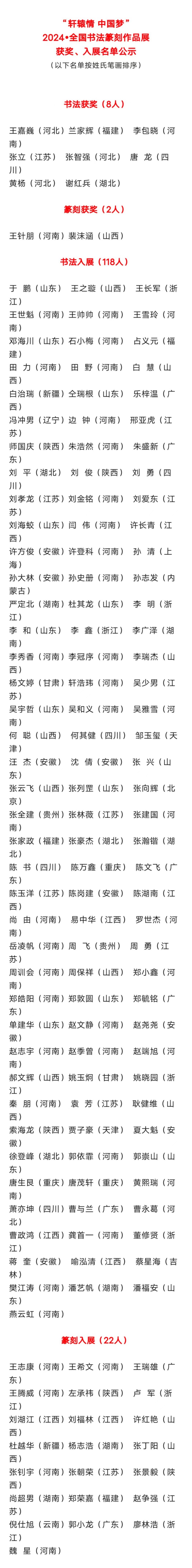 2月24日晚,黄帝故里拜祖大典系列活动之一,河南省文学艺术界联合会、河南省书法家协会、郑州市政协等单位共同举办的“轩辕情·中国梦”——2024全国书法篆刻作品展经过多轮评选,评选结果正式出炉,共140件作品入展,10件作品获奖。