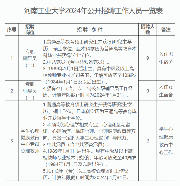 近日,河南工业大学发布招聘公告,拟面向社会公开招聘工作人员20名,其中专职辅导员18名、学生心理健康教育中心专职心理教师2名。