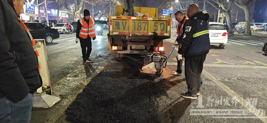 “近期,由于雨雪天气频临,造成道路积雪积水下渗,加上气温较低,给这条道路路面设施造成了多处破损。白天该路段车流量大,为了不影响交通,我们定为晚上进行抢修,对问题较为严重的南阳路岗杜街周边坑洼坑洞进行全面整治,其他路段进行举一反三的修补,彻底解决这条路的坑洼不平问题。”金水区城管局工作人员介绍。