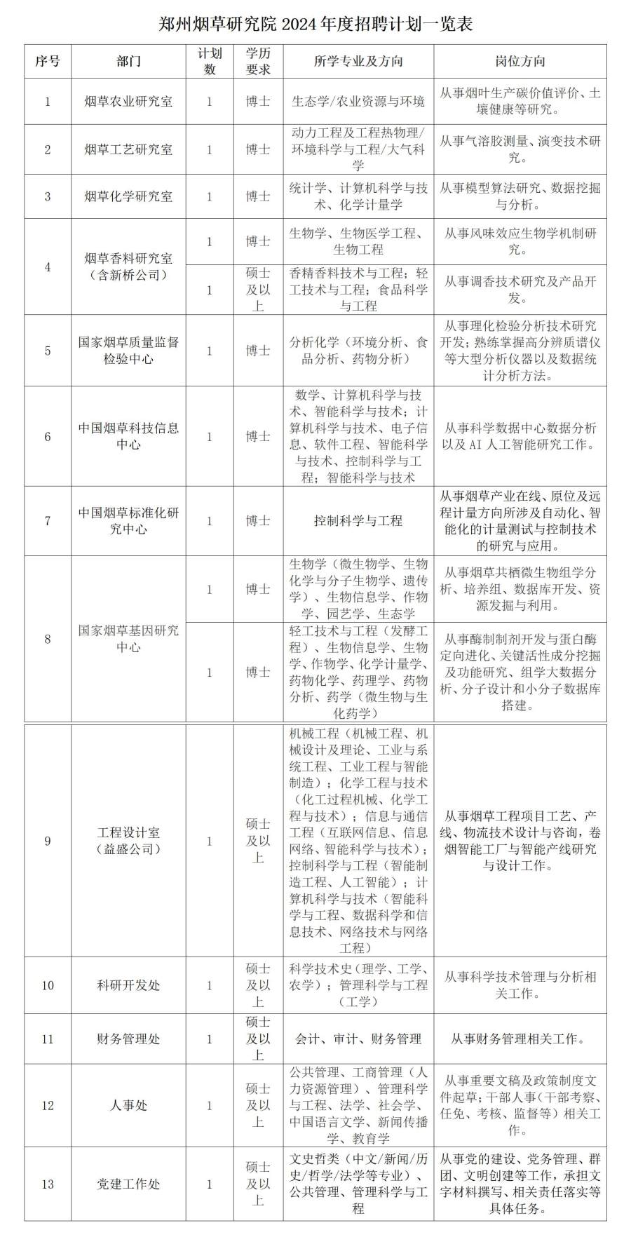 近日,中国烟草总公司郑州烟草研究院发布公告,面向2024年应届毕业生、出站博士后或留学回国人员计划招聘15人,即日起至3月20日,符合条件的应聘人员可按要求进行报名。
