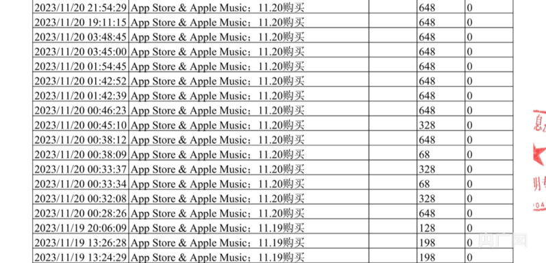 从刘先生提供的消费电子账单来看,仅2023年11月20日一天,App Store & Apple Music中共有15笔消费,其中有10笔消费每单为648元,另有3笔328元的消费和2笔68元的消费。