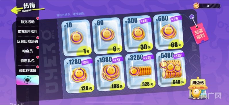 记者在《蛋仔派对》“热销”频道看到,“蛋币充值”含1元、6元、30元、68元、128元、198元、328元、648元六个档位。此外,还有抽盲盒等多种消费项目。