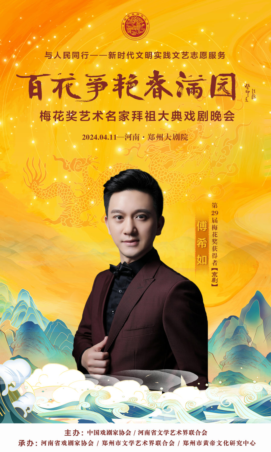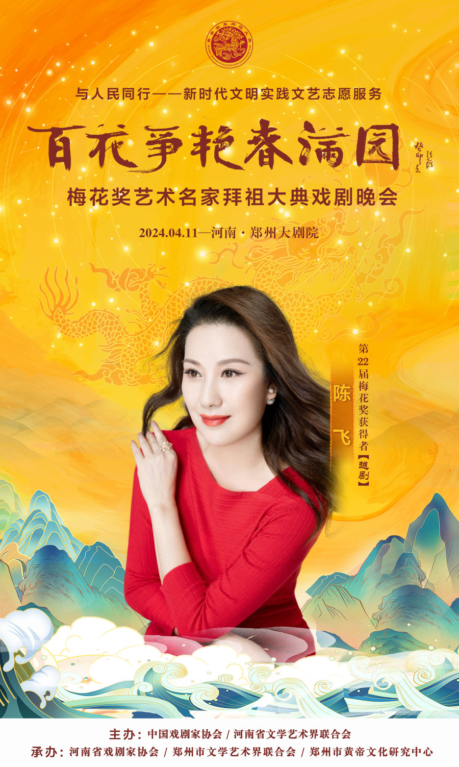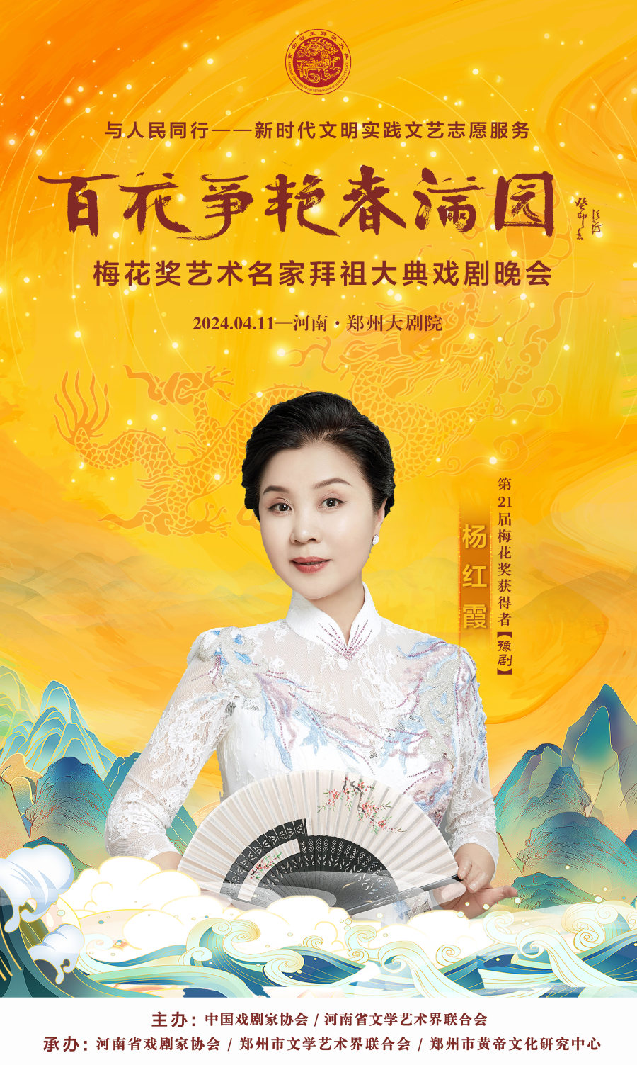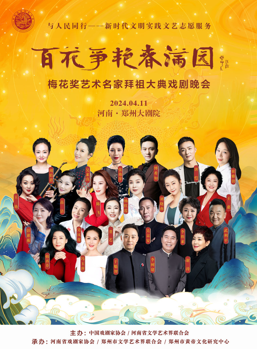 作为甲辰年黄帝故里拜祖大典的系列活动之一,4月11日晚,与人民同行——新时代文明实践文艺志愿服务“百花争艳春满园”梅花奖艺术名家拜祖大典戏剧晚会将在郑州大剧院歌舞剧场举办。届时,获得中国戏剧表演艺术最高奖的20名“梅花奖”得主将齐聚“天地之中”,共同唱响中华儿女同根同心的心声,为前来拜祖的海内外嘉宾和广大戏迷献上戏剧盛宴。