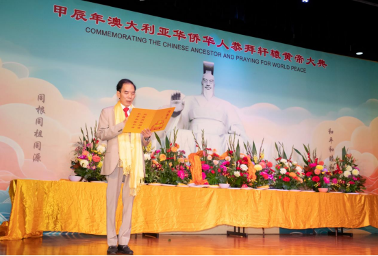 第五项仪程:恭读拜文。“念吾祖之圣德兮,永世不忘。思来日之可追兮,振翅一往。……”澳洲著名侨领、澳洲潮州同乡会会长李国兴怀着崇敬的心情,领颂甲辰年澳大利亚华侨华人恭拜轩辕黄帝大典拜祖文。