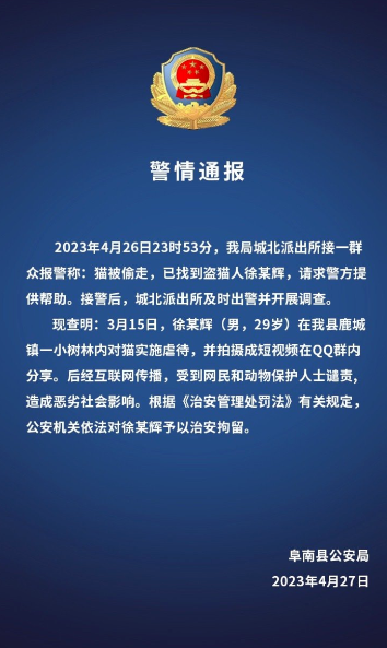2023年4月,有网友爆料称,知名美食博主徐某辉(网名@杰克辣条 )在“处刑式虐猫”,对猫拔指甲、铁签穿刺、火烧、拖行踩踏,捆绑在树上活活肢解,折磨超一小时;徐志辉还自称曾长期大量捕捉流浪猫后残忍虐杀,并拍摄虐杀视频上传网络炫耀、贩卖。4月27日,阜南县公安局发布警情通报证实,徐某辉在阜南县鹿城镇一小树林内对猫实施虐待,并拍摄成短视频在QQ群内分享。后经互联网传播,受到网民和动物保护人士谴责,造成恶劣社会影响。根据《治安管理处罚法》有关规定,公安机关依法对徐某辉予以治安拘留。