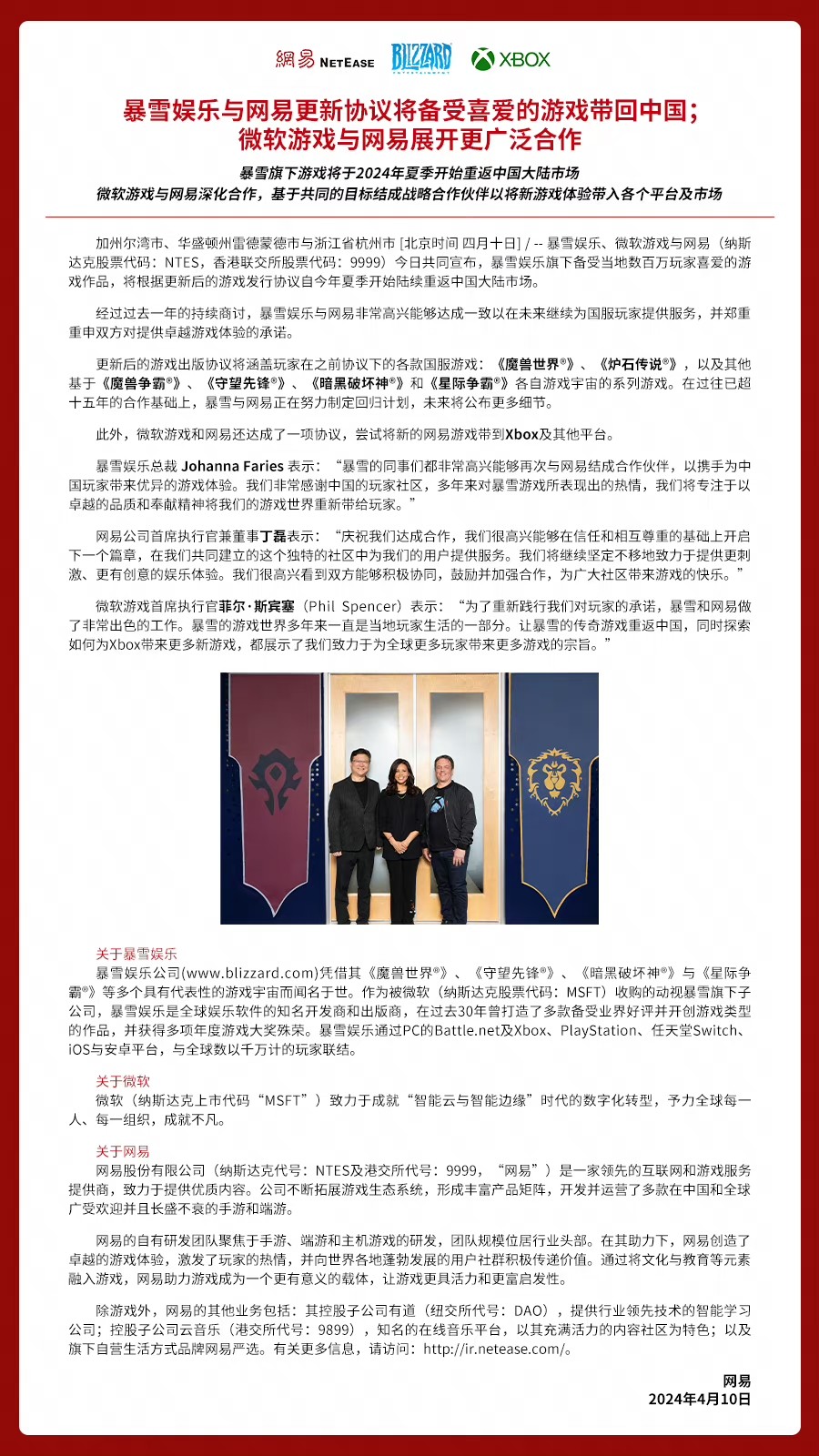 4月10日,网易官方微博正式宣布与微软达成协议,《魔兽世界》等暴雪游戏今年夏季将重返中国大陆市场。