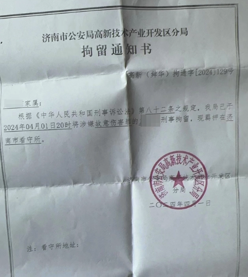 此后,当地警方进行处置,双方签订了和解协议。可没过两天,小超父亲收到济南市公安局高新技术开发区分局的拘留通知书,小超因涉嫌故意伤害罪被刑事拘留。这一罪名,让小超父亲以及网友们无法接受。