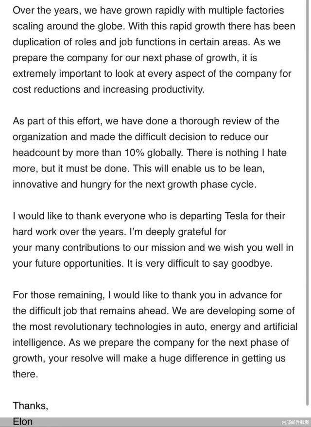 马斯克坦言,特斯拉快速发展,某些领域角色和工作职能出现重叠。在为特斯拉下一阶段发展做好准备时,同时为降低成本和提高生产率,审视公司方方面面显得极其重要。作为其中一部分,特斯拉对组织进行彻底审查并作出艰难决定,即在全球范围内裁员10%,这将使特斯拉能够精益求精,为下一个增长阶段周期做好准备。在谈及特斯拉的未来时,马斯克直言,特斯拉正在研究汽车、能源和人工智能领域的一些最具革命性技术。