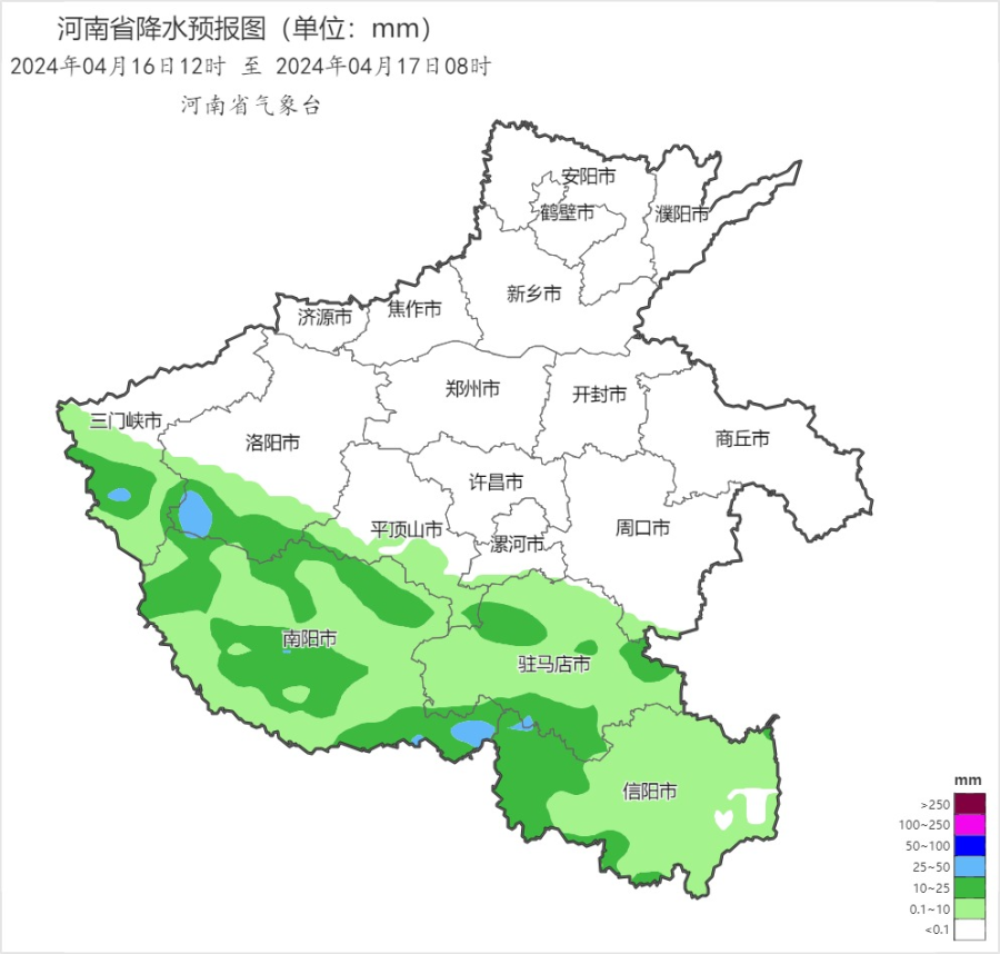 今天下午到夜里,西部、南部阴天间多云,三门峡南部、洛阳南部、平顶山南部、南阳、信阳、驻马店有阵雨、雷阵雨,部分县市中雨,局部大雨并伴有短时强降水等强对流天气;其他县市多云。