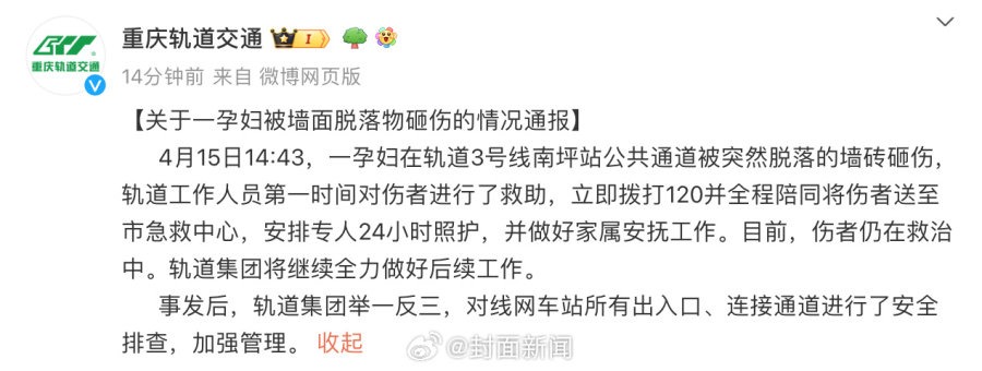 重庆一孕妇被地铁站墙砖砸伤,亲属:大人还在ICU,胎儿未保住