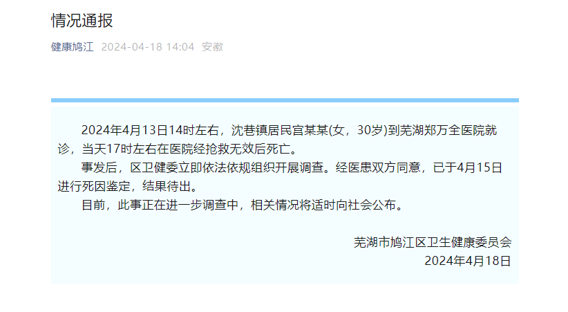 此前,据媒体报道,4月13日,安徽芜湖市鸠江区31岁女子宫女士在当地一家医院输液后身亡。家属称,宫女士只是因为感冒去输液,质疑院方输错药品导致其死亡。