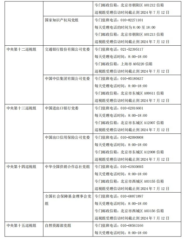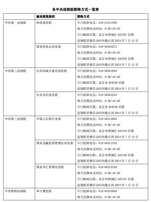 据了解,15个中央巡视组将在被巡视单位工作3个月左右,巡视期间设立专门值班电话和邮政信箱,受理干部群众的来信来电来访。巡视组每天受理电话的时间为8:00至18:00,受理信访时间截止到2024年7月12日。