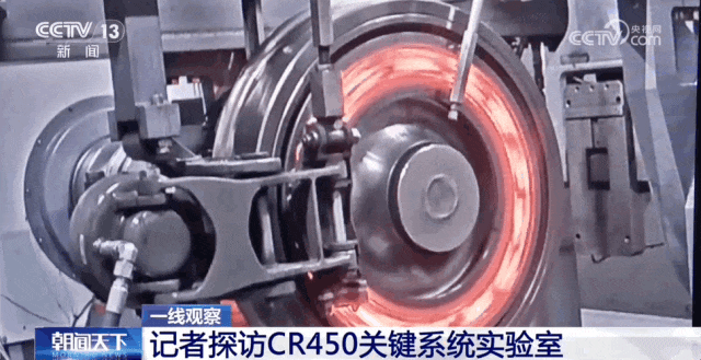 下图中高速旋转的红色圆盘正在测试的就是闸片和制动盘的匹配度,看看刹车系统靠不靠谱。这个烧红的圆盘正在不停地采集数据,列车的智能系统也正精准计算出起步、提速、停车的最佳方案。