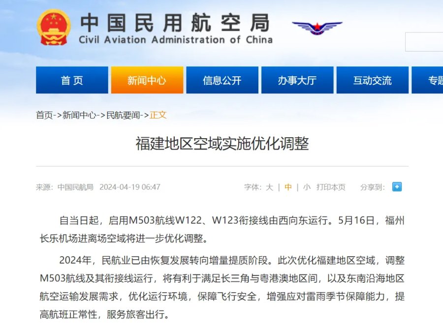 2024年,民航业已由恢复发展转向增量提质阶段。此次优化福建地区空域,调整M503航线及其衔接线运行,将有利于满足长三角与粤港澳地区间,以及东南沿海地区航空运输发展需求,优化运行环境,保障飞行安全,增强应对雷雨季节保障能力,提高航班正常性,服务旅客出行。