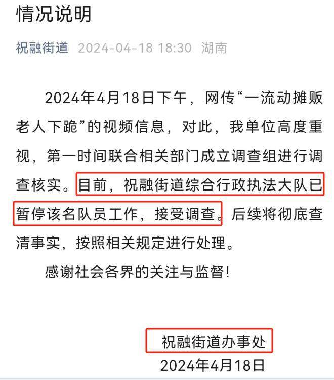 老人这一跪,让人心酸。很多网友评论说:“视频传到哪了?”足以说明这起事件引起的争议有多大,大家心里有多不舒服,有多希望事件得到妥善处理。