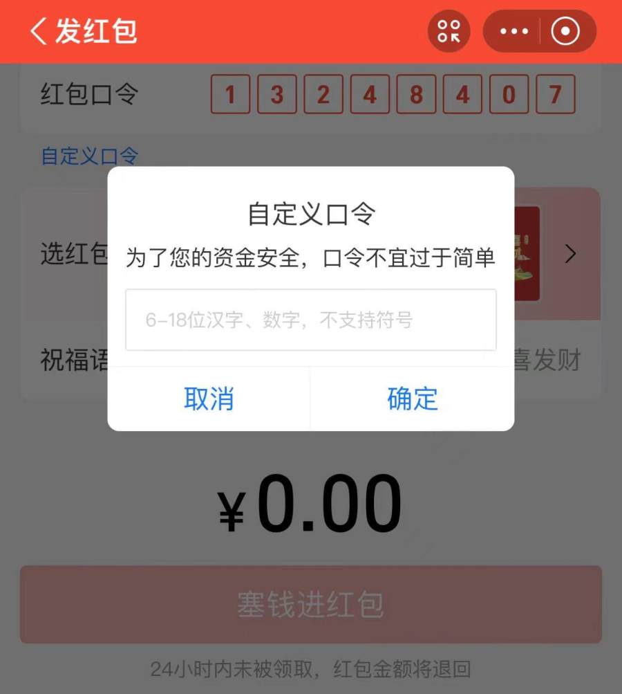 用户点击发口令红包,按提示填写红包个数,选择拼手气或平均金额模式,设置红包口令。之后点击塞钱进红包,支付完成后,将口令分享给领取方即为发送成功。