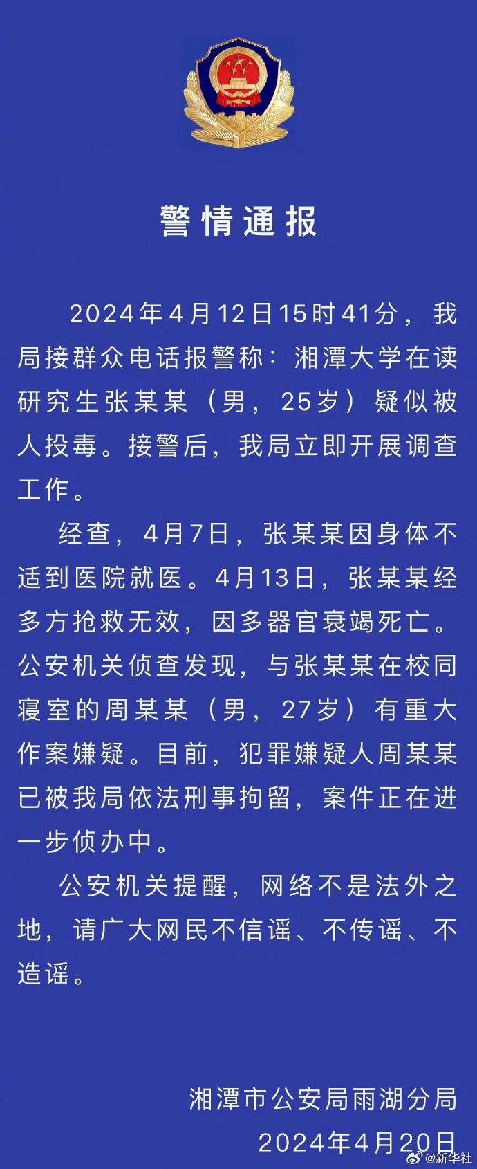 网传“湘潭大学学生被投毒”,警方:张某某因器官衰竭死亡,同寝室友已被刑拘
