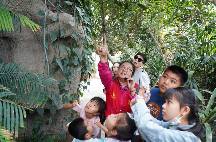 郑州植物园展览温室内热带雨林植物丰富,展示了独木成林、空中花园、板根、绞杀、老茎生花等特有现象,还种植有旅人蕉、菩提树、箭毒木、曼陀罗等特色植物。在雨林探秘环节,组织者向孩子们讲解了特色植物背后的故事,帮助孩子们了解热带雨林环境、气候特点、植物群落等,引导他们关注地球热带雨林环境,珍惜地球资源。
