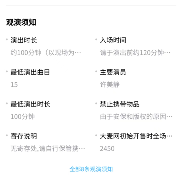乔女士表示,自己得知演唱会消息时就注意到,这次活动名称为“梦见许美静见面音乐会”。“我觉得这个字眼上是有差别的,在小红书上也看到过有其他歌迷说,这场‘见面音乐会’只会唱10首歌。但我在大麦网站上看到,最低演出曲目标明是15首,所以也抱着很大期待。即便她能唱10首我也能接受,但没想到是这样的见面会。”