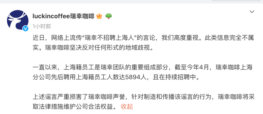 @luckincoffee瑞幸咖啡 回应“不招聘上海人”传闻。微博截图
