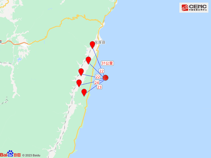周边县城:震中距凤林镇22公里、距寿丰乡22公里、距丰滨乡23公里、距光复乡24公里、距吉安乡31公里,距台湾花莲县33公里,距台北市149公里。