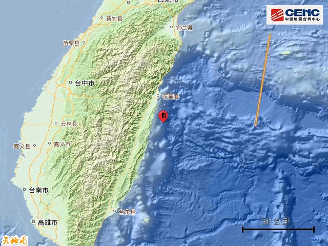 中国地震台网正式测定:04月23日02时26分在台湾花莲县海域(北纬23.70度,东经121.68度)发生6.3级地震,震源深度10千米,距台湾岛约12千米。