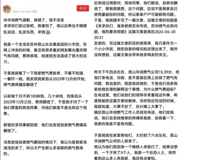 整个经历实在细思恐极,女子的家庭住址怎么就轻易暴露了?配偶的工作单位又是怎么被查到的?据女子叙述,自己前一天刚在网上质疑燃气费上涨,后一天当地苏州天然气公司就找到她,上门进行检查和解释。