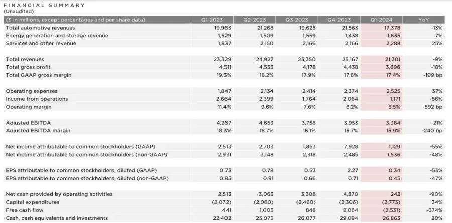 北京时间4月24日,特斯拉发布2024年一季度财报,一季度营收为213亿美元(约1543亿元人民币),同比下降9%,归属于特斯拉普通股股东的净利润为11.29亿美元,同比下降55%。此外,特斯拉CEO埃隆·马斯克在财报电话会上透露,或将加速新车型推出,新车型最快于今年末推出,包括更便宜的车型。