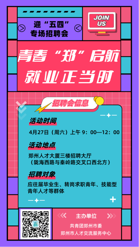 温馨提醒:招聘会举办时间为4月27日(周六)上午9:00至12:00,地点为郑州人才大厦三楼招聘大厅,请求职者提前准备好简历,届时有序入场。了解更多岗位,可关注“郑州市人才交流中心”官方微博、微信公众号。