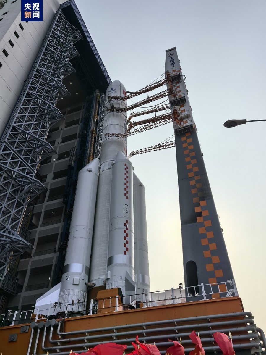 4月27日,承载着长征五号遥八运载火箭的活动发射平台,缓缓将器箭组合体从垂直测试厂房安全转运至发射区。后续将按计划开展各项功能检查、联合测试、推进剂加注等工作。