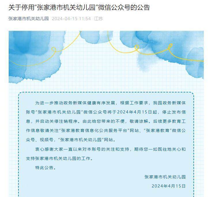 记者发现,关停现象最早从当地幼儿园开始,基本集中在4月上旬。如,张家港市机关幼儿园在4月15日发布公告称:为进一步推动政务新媒体健康有序发展,根据工作要求,我园政务新媒体账号“张家港市机关幼儿园”微信公众号将于2024年4月15日起,停止发布信息,并启动关停注销程序。由此给您带来的不便,敬请谅解。后续更多教育工作信息敬请关注“张家港教育信息化公共服务平台”网站、“张家港教育”微信公众号、视频号,“张家港市机关幼儿园”网站。