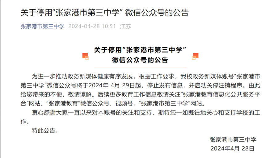 记者看到,4月28日10:51,张家港市第三中学还在发布停用公告。内容如下:为进一步推动政务新媒体健康有序发展,根据工作要求,我校政务新媒体账号“张家港市第三中学”微信公众号将于2024年4月29日起,停止发布信息,并启动关停注销程序。由此给您带来的不便,敬请谅解。后续更多教育工作信息敬请关注“张家港教育信息化公共服务平台”网站、“张家港教育”微信公众号、视频号,“张家港市第三中学”网站。