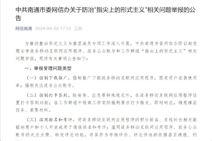 记者还注意到,江苏省内,4月26日,南通市委网信办刚刚发布关于防治“指尖上的形式主义”相关问题举报的公告,就是为了推动整治形式主义为基层减负专项工作深入开展,受理的也都是全市政务移动互联网应用程序、政务公众账号和工作群组“指尖上的形式主义”相关问题。