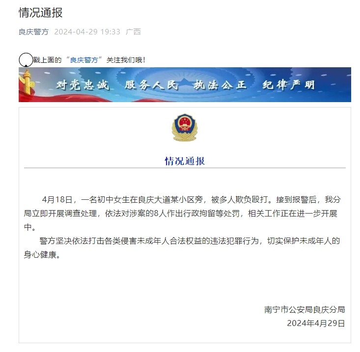 南宁市公安局良庆分局4月29日发布情况通报:4月18日,一名初中女生在良庆大道某小区旁,被多人欺负殴打。接到报警后,该分局立即开展调查处理,依法对涉案的8人作出行政拘留等处罚,相关工作正在进一步开展中。