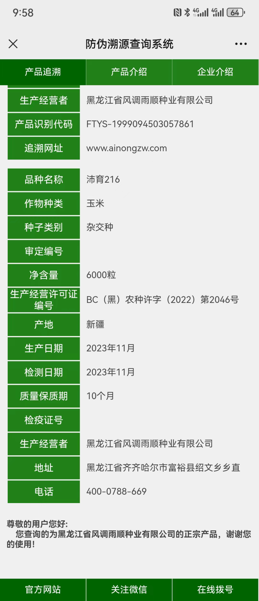 扫描“沛育216”包装袋上的二维码,无法显示审定编号