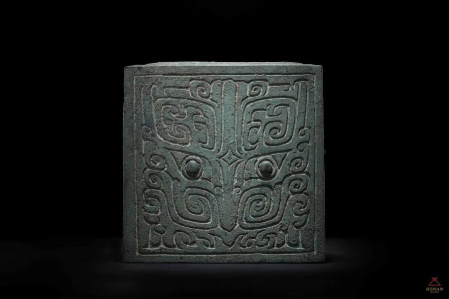 兽面纹青铜建筑构件,青铜器,商代文物,高19厘米、横18.8厘米、纵16.3厘米,重6千克,通体呈铜绿色。1989年河南省郑州市小双桥遗址采集,现藏河南博物院。