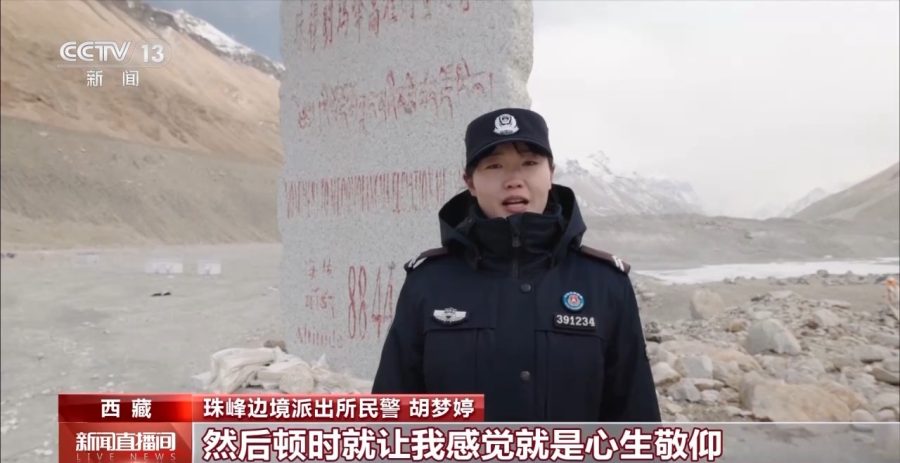 珠峰边境派出所民警 胡梦婷:一次偶然的机会,我看到珠峰边境派出所的民警在珠穆朗玛峰脚下巡逻的报道,顿时就让我心生敬仰,也心驰向往,我退伍之后报名参加了国考,并且主动申请到珠峰边境派出所。