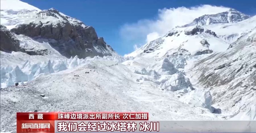 珠峰边境派出所副所长 次仁加措:往里走的话我们会经过冰塔林、冰川,穿越碎石滩,整个路途我们会花费8到12个小时,途中经过老大本营,那个地方是最危险的路段。