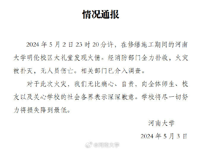 河南大学5月3日发情况通报:5月2日23时20分许,在修缮施工期间的河南大学明伦校区大礼堂发现火情。经消防部门全力扑救,火灾被扑灭,无人员伤亡。相关部门已介入调查。