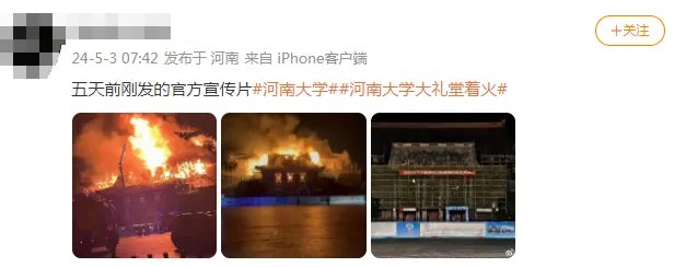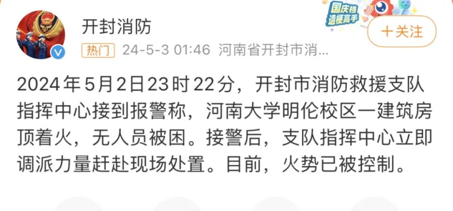 5月3日1时46分,开封消防发布官方通报称:“2024年5月2日23时22分,开封市消防救援支队指挥中心接到报警称,河南大学明伦校区一建筑房顶着火,无人员被困。接警后,支队指挥中心立即调派力量赶赴现场处置。目前,火势已被控制。”