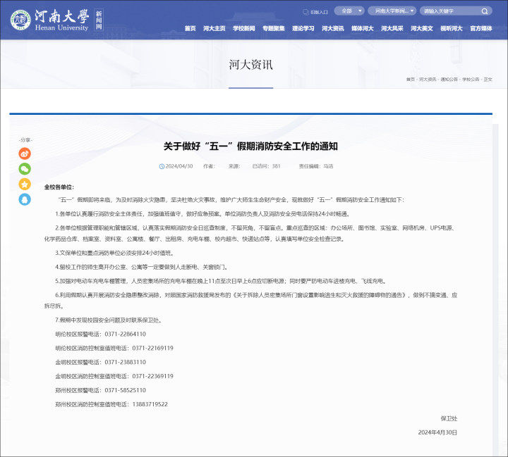 记者查询河南大学官网,4月30日,学校曾下发《关于做好“五一”假期消防安全工作的通知》。