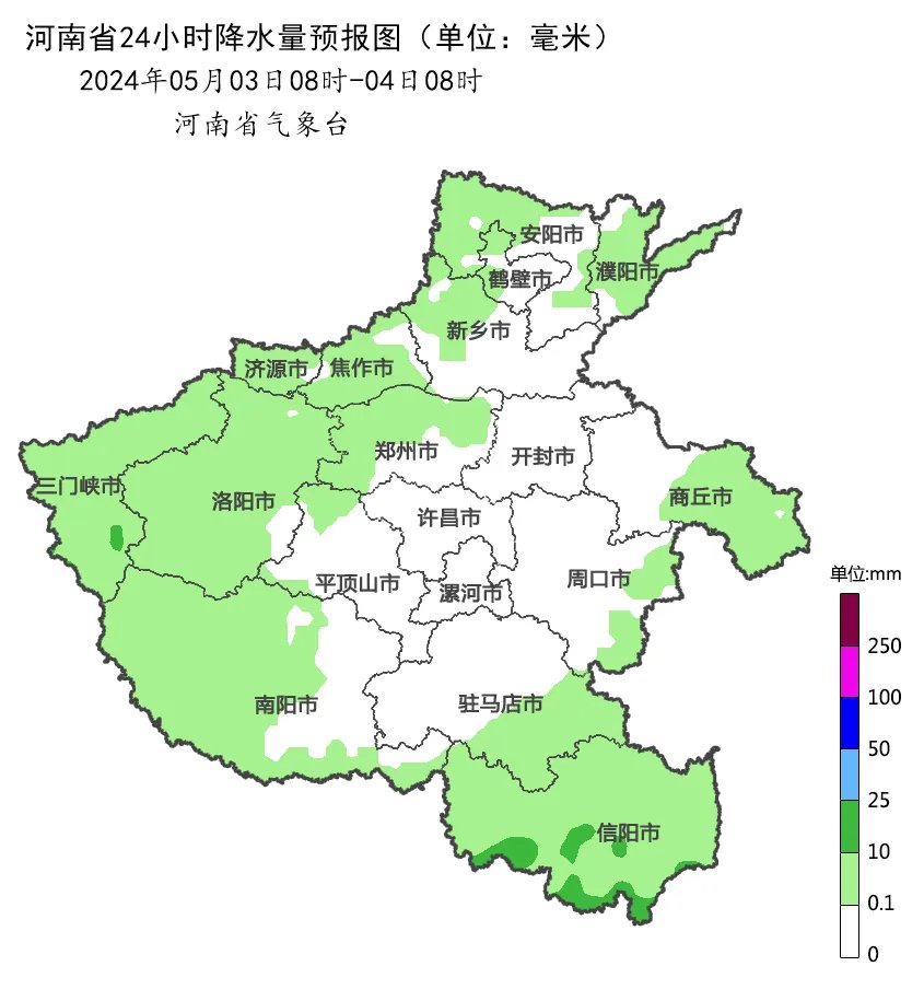 三门峡、洛阳、南阳、信阳大部分县市有阵雨、雷阵雨;济源、焦作、新乡南部、郑州、开封、商丘、许昌、平顶山、漯河、周口、驻马店局部有阵雨、雷阵雨。